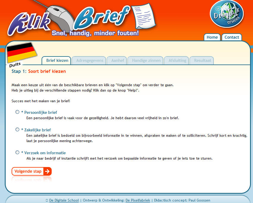 In dit kader wijs ik wat betreft correspondentie (brieven, mailtjes etc.) ook graag op een al heel oude vertrouwde: http://klikbrief.nl. Dit voor Duits, Engels, Frans, Nederlands en Spaans beschikbare programma helpt leerlingen bij het opstellen van correspondentie van allerlei soort. Ze kiezen de gewenste taal en vervolgens of het om zakelijke correspondentie (brief, verzoek om informatie, etc.) of een privé-brief moet gaan en komen dan in een scherm waar ze gegevens over afzender en ontvanger moeten invullen. Vergeten ze iets dan krijgen ze een waarschuwing te zien en kunnen na correctie verder.